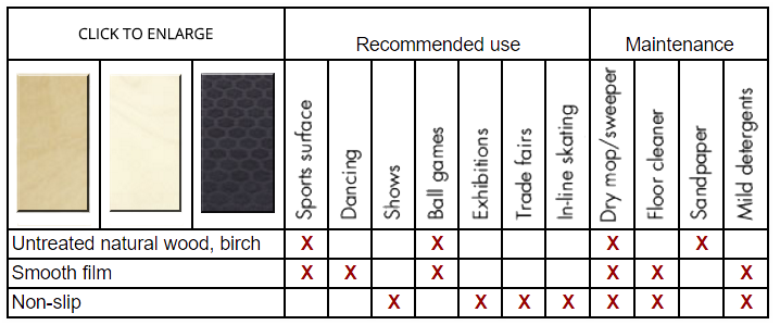 - Several finishes, and combinations of finishes, are possible. Eg, one side (non-slip) for exhibitions, trade fairs, in-line skating, etc, - and the other side (smooth) for dancing, Taraflex (or the like) and/or other sports activities.